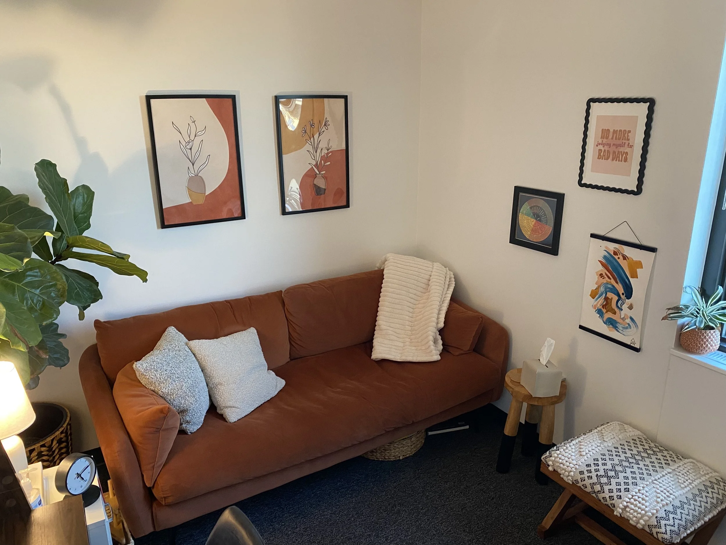 Restrooms - There is a public restroom near the elevators. Please use this restroom prior to arriving for your session. The restroom within our suite is for clinicians only. Whether before or after your session, we ask that you use the public restrooms only so that our therapists are able to utilize ours between their sessions in order to grab their clients on time.